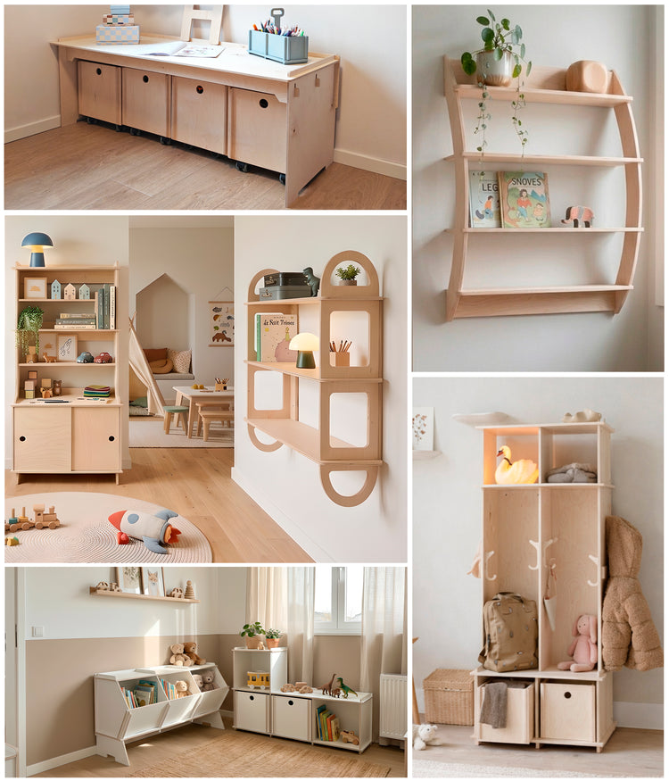 I kollektionen arbejdes der bevidst med skæve vinkler, bløde former og åbne konstruktioner, som giver møblerne et let og levende udtryk. Det gør dem til en naturlig del af børneværelset, hvor både leg, kreativitet og ro får plads.