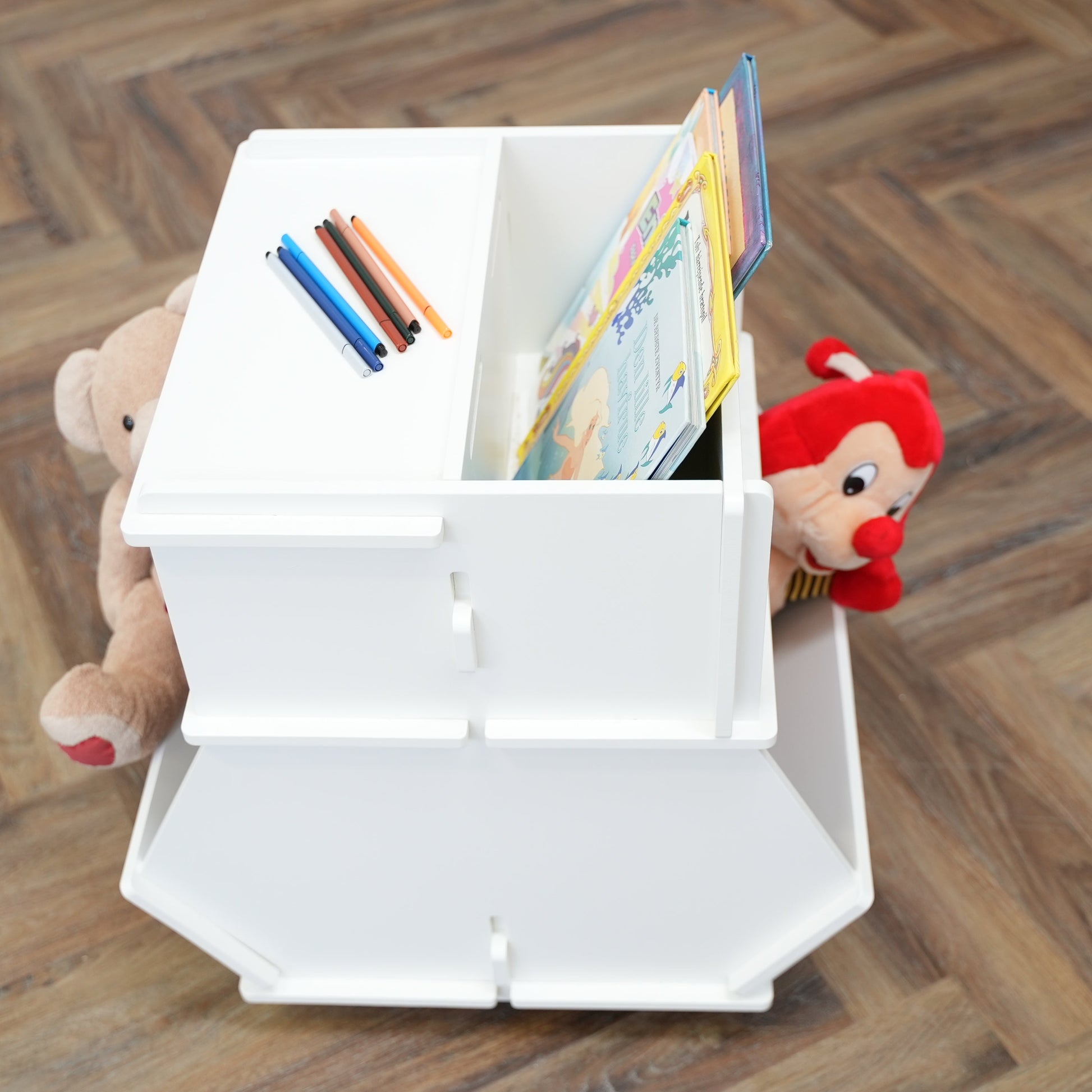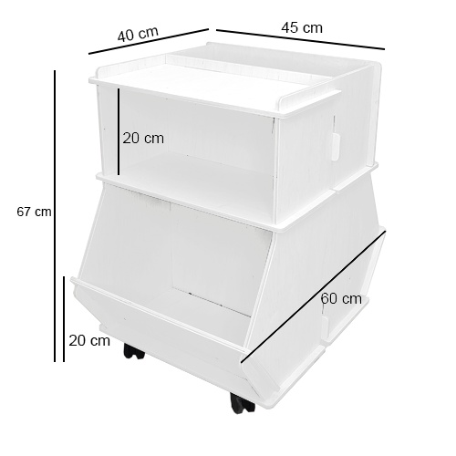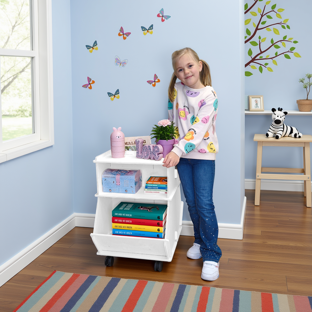 Alberte er en smart og funktionel rullevogn, designet til at rumme alt, hvad familiens mindste måtte have brug for – fra legetøj og kreating til bøger og mere.