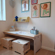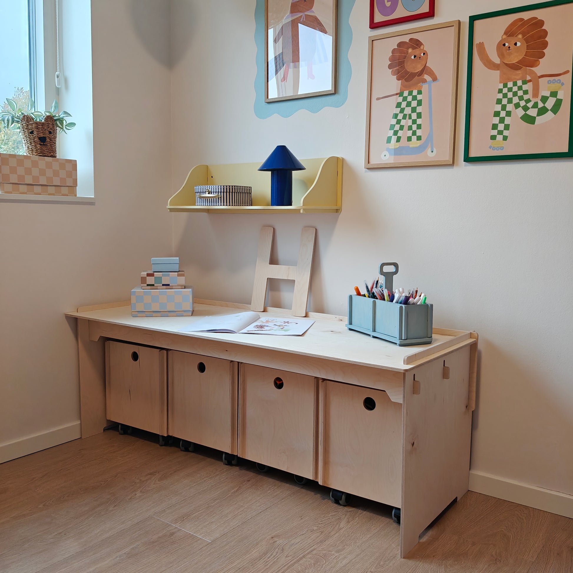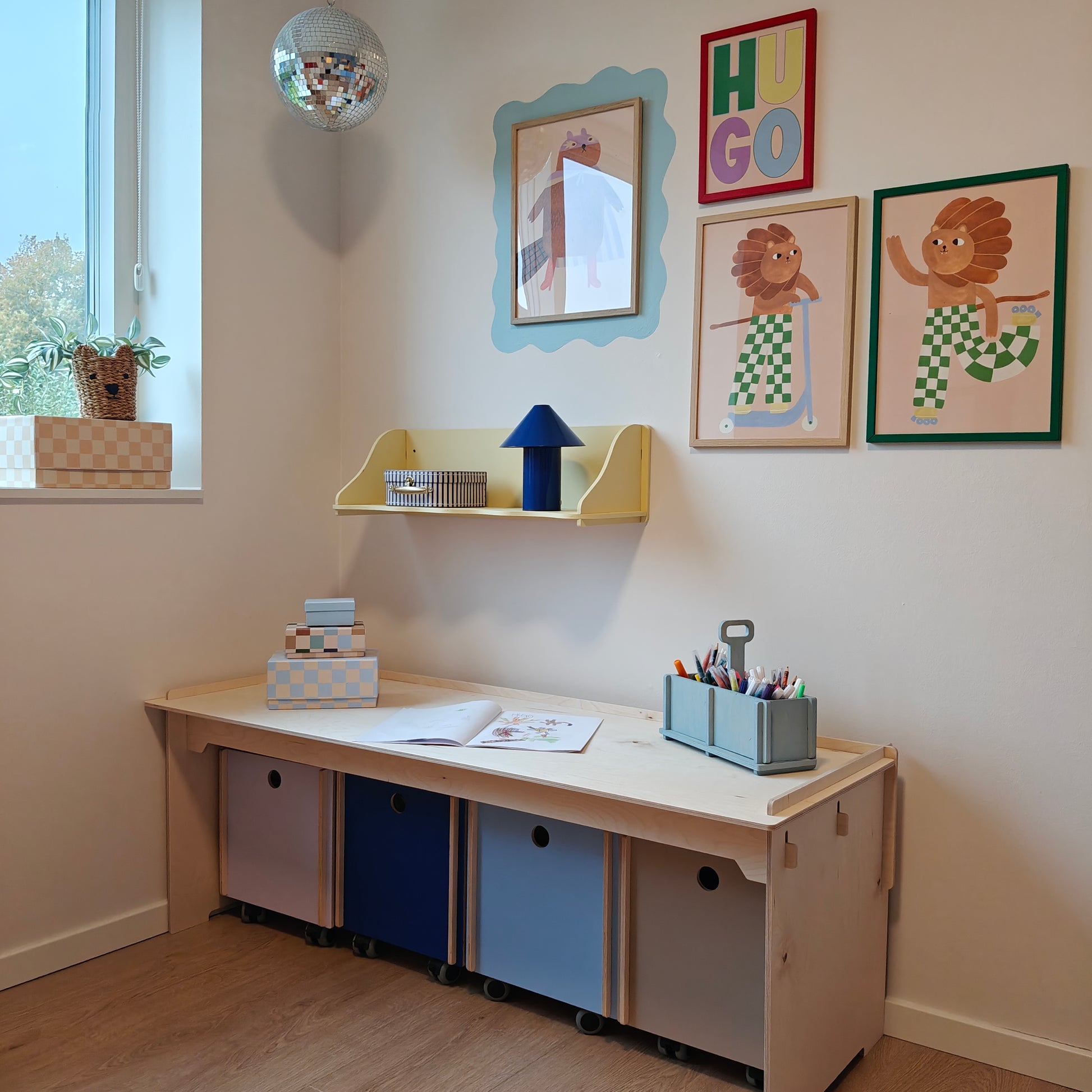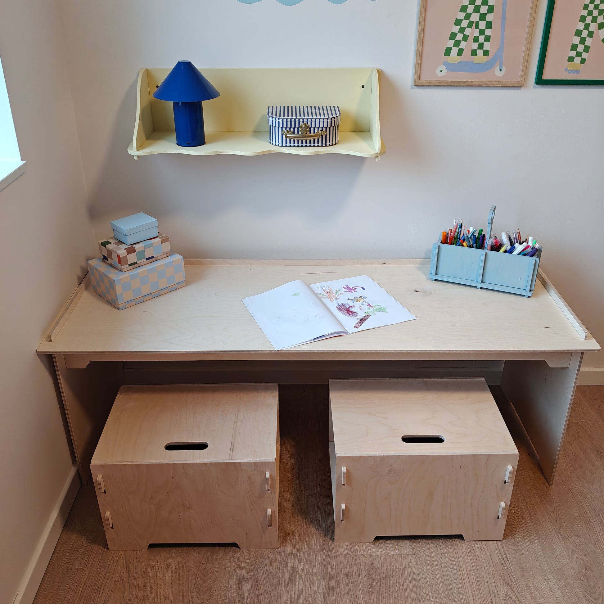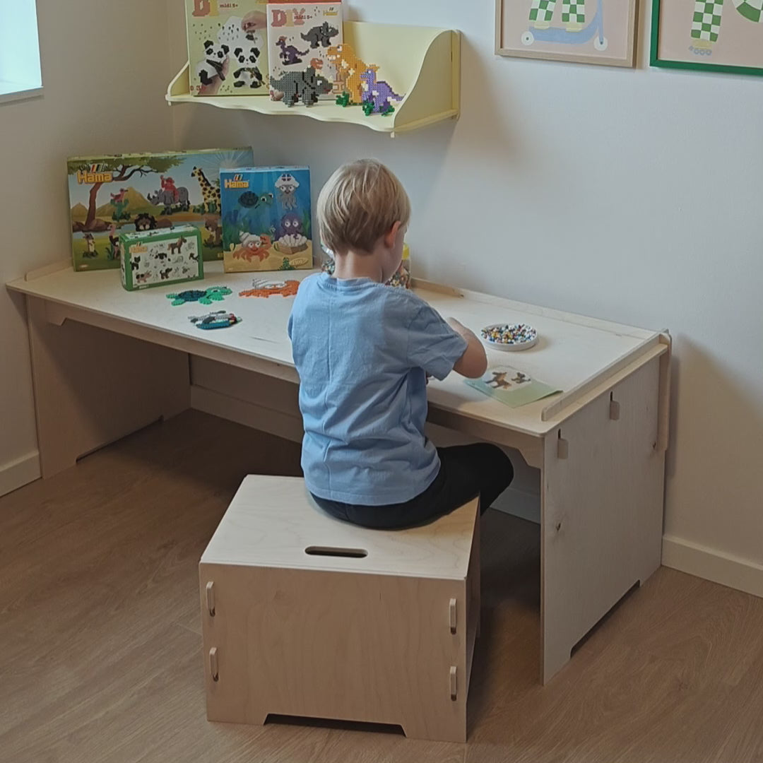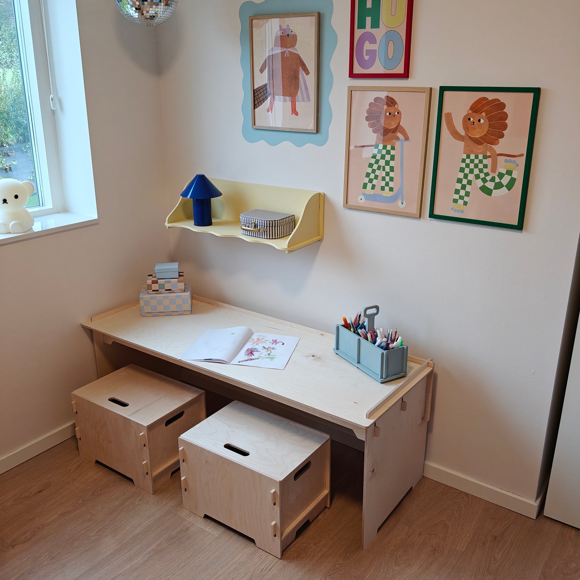 Ved siden af står Frida, den fine taburet med et praktisk opbevaringsrum under sædet – perfekt til farver, papir og små skatte. Sammen udgør de to møbler et funktionelt og indbydende centrum for hverdagens leg og fantasi.