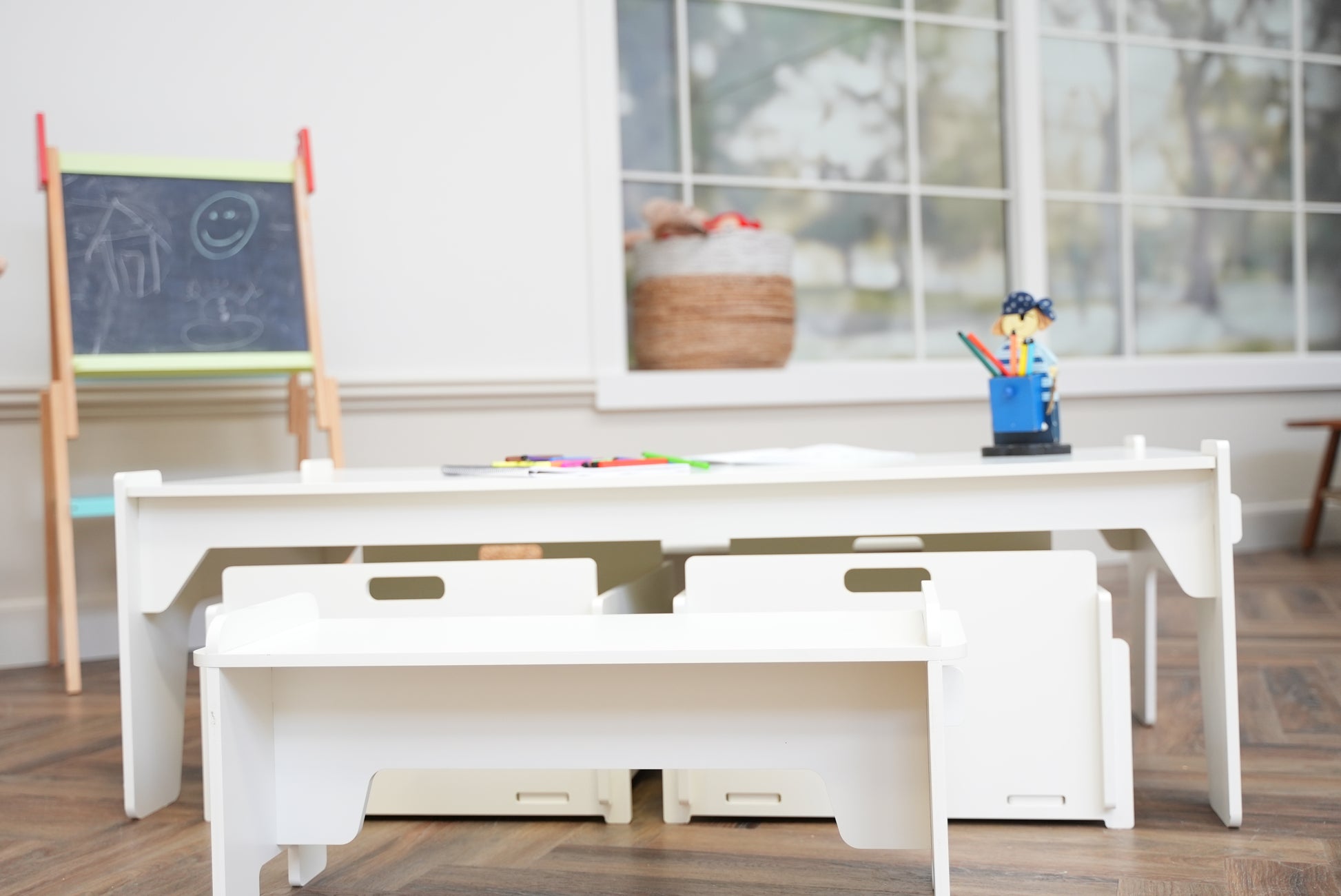 Du vil elske vores kombisæt, der forener det store og rummelige legetøjsbord Bjørn med de smukke, store opbevaringskasser Stine i træ.