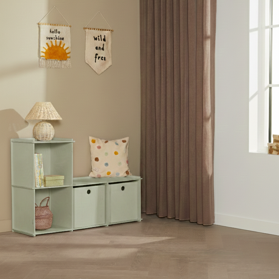 Reol, bænk, legebord. Vi har forsøgt at skabe et multifunktionelt møbel, som giver mulighed for en masse opbevaring af alle sagerne på børneværelset.