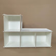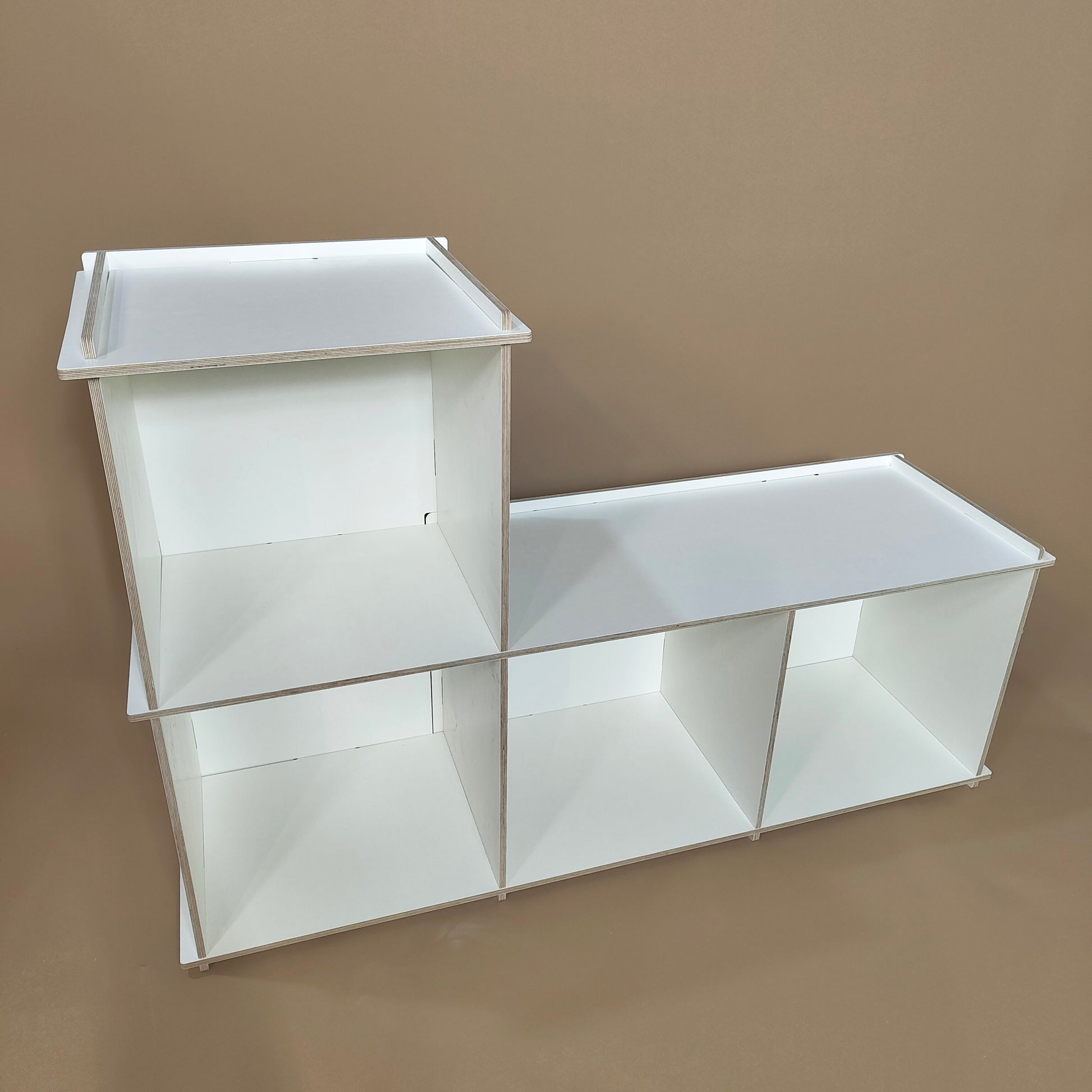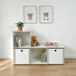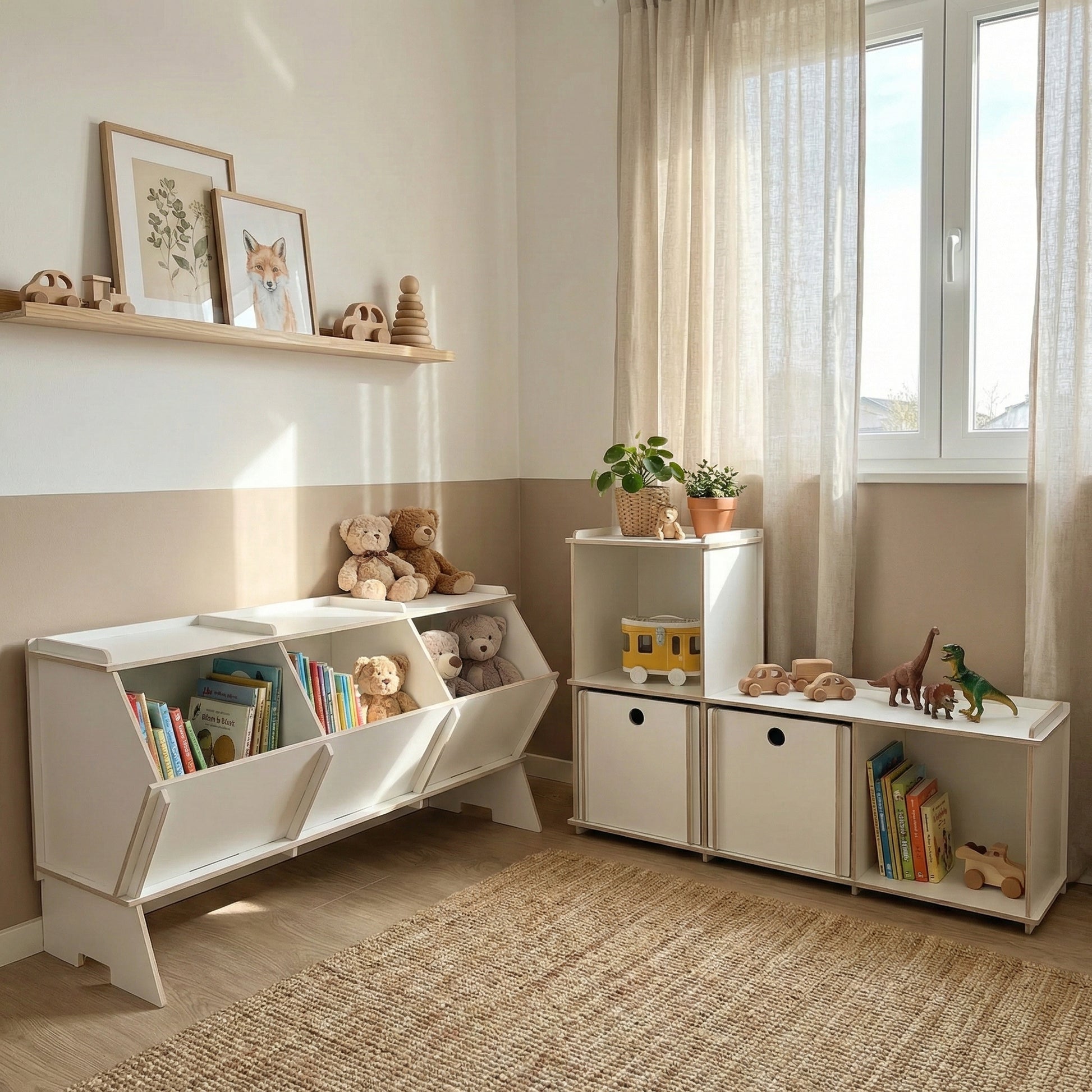 Reol, bænk, legebord. Vi har forsøgt at skabe et multifunktionelt møbel, som giver mulighed for en masse opbevaring af alle sagerne på børneværelset.