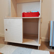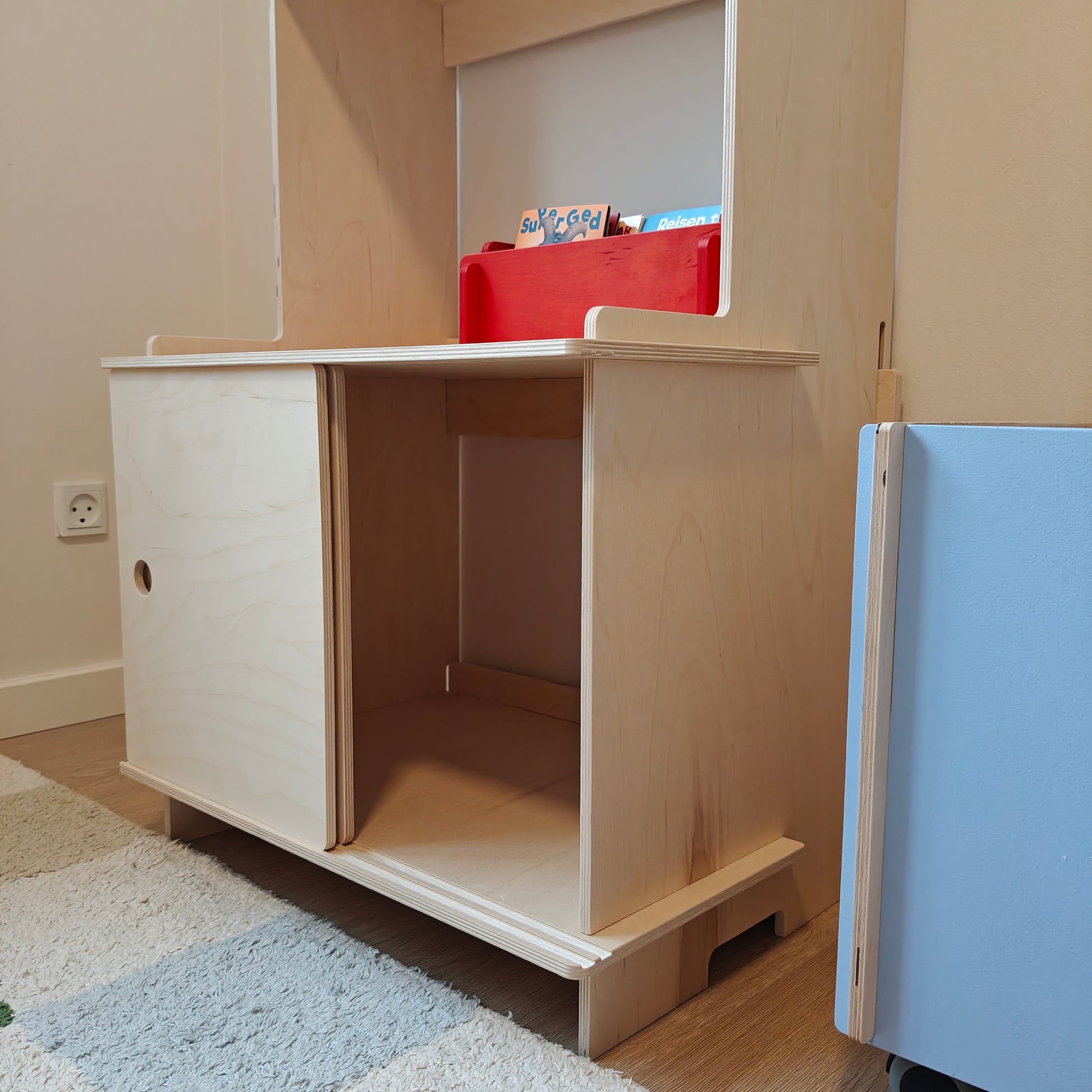 De rene linjer og det naturlige træ giver et let og harmonisk udtryk, mens de to skydelåger i bunden gør det nemt at gemme legetøj, bøger eller kreative sager af vejen.