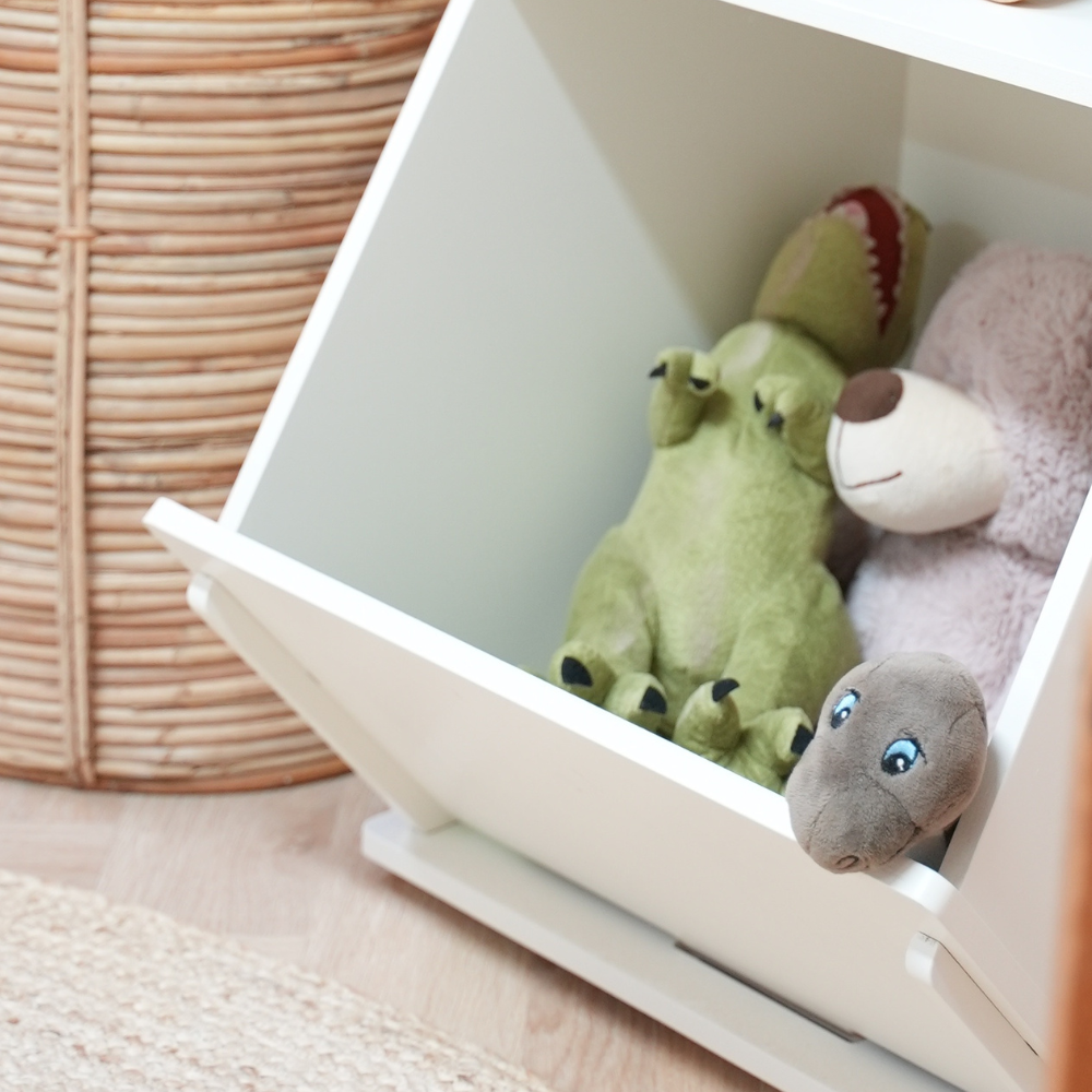 Reolkassen Olivia, med en højde på 80 cm, er perfekt til at holde styr på alle børneværelsets skatte. Hvis du leder efter et møbel, der kan rumme byggeklodser, køkkensager, dukketøj, udklædningstøj, bøger, spil og meget mere, så er Olivia den ideelle løsning.Mål: H: 80 cm x D: 30 cm x B: 45 cm